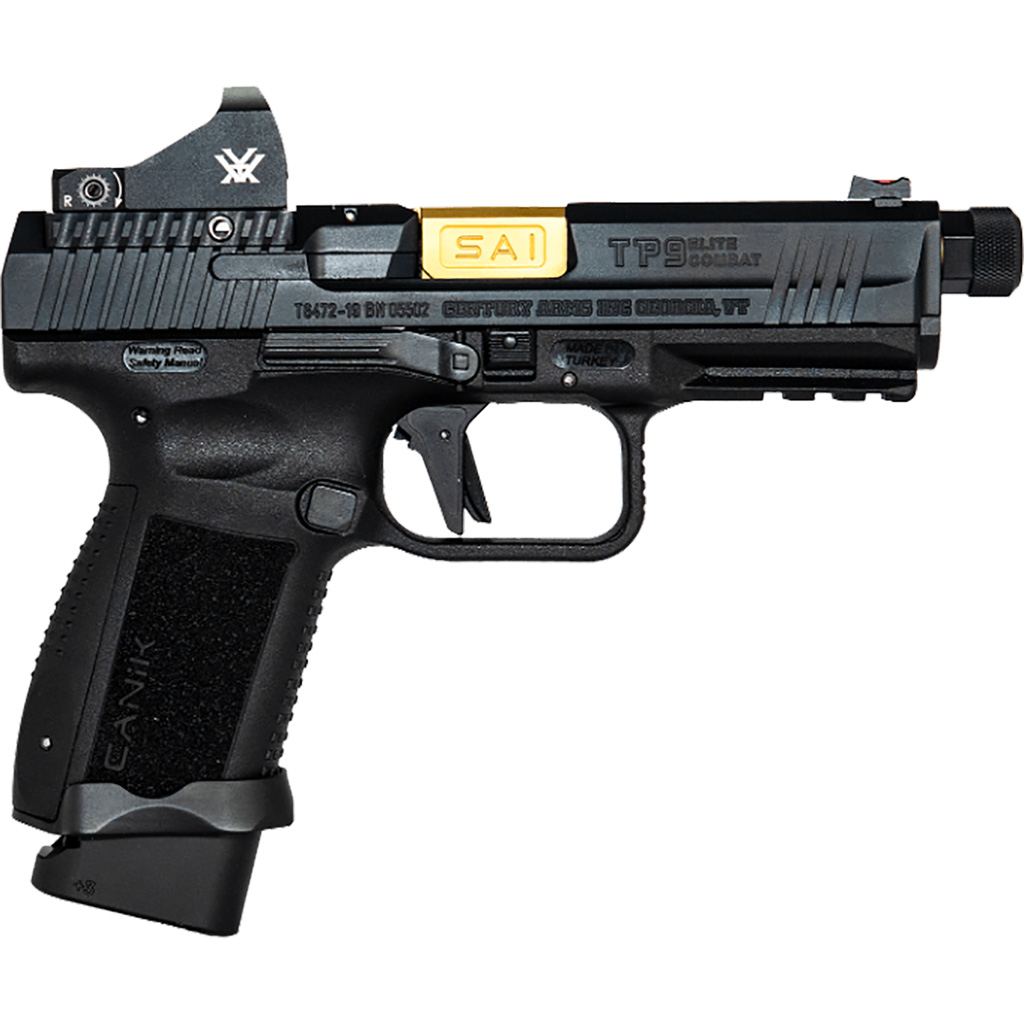 The TP9 Elite Combat Executive pistol uses performance upgrades designed by Salient Arms International. The Executive features a gold barrel designed by Salient that is fluted, match-grade and PVD-coated. This handgun is suppressor ready with 1/2×28” right-hand threads and includes a proprietary Convex thread protector. Outfitted with a flat-face aluminum trigger with a black full-face safety. The optics-ready slide comes with an adapter plate and charging handle. The slide, barrel and small steel parts are nitride-coated while internal components are nitride or high-wear nickel-coated. Includes a 15-round magazine with a +3 extension. This model comes equipped with a Vortex Viper red dot sight.