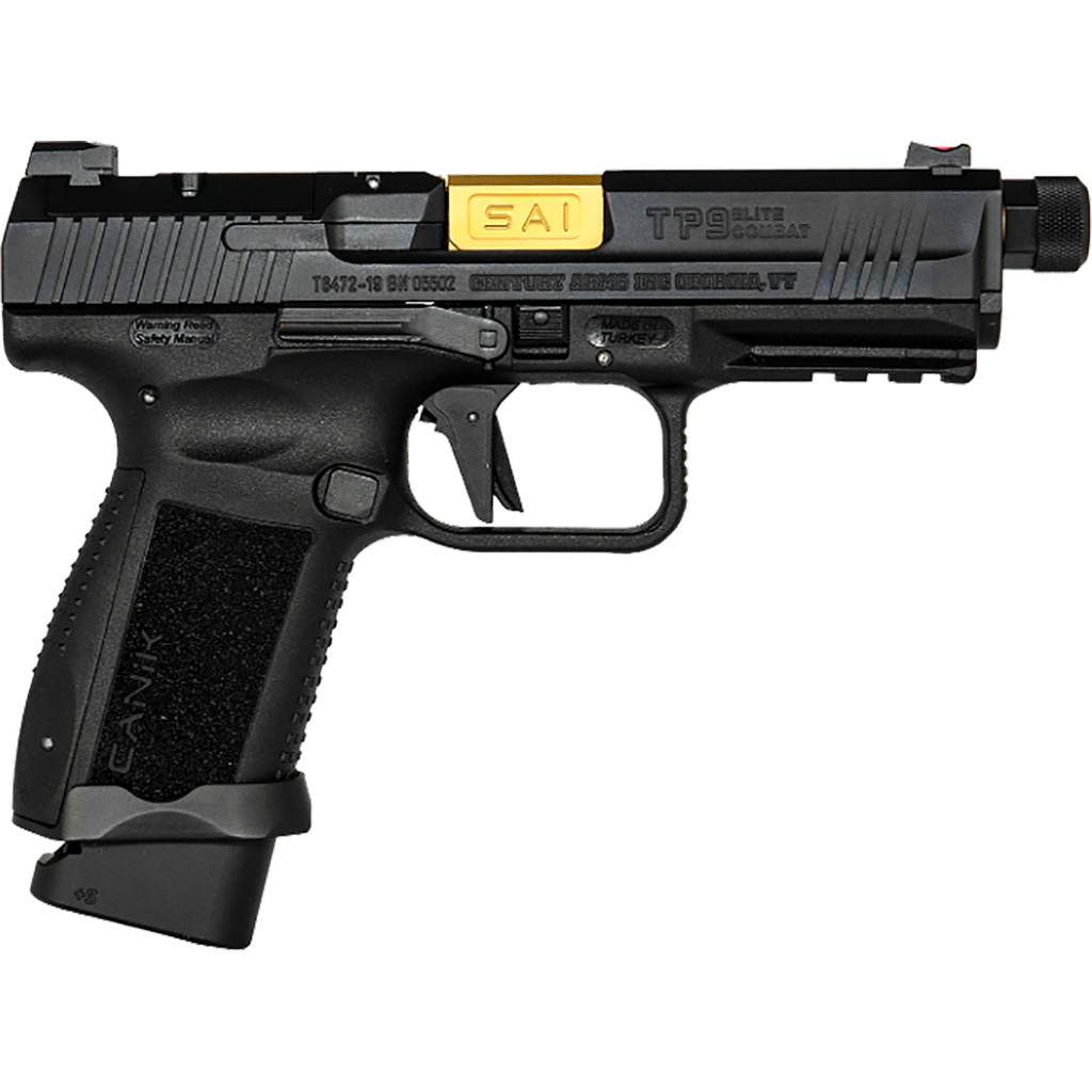 The TP9 Elite Combat Executive pistol uses performance upgrades designed by Salient Arms International. The Executive features a gold barrel designed by Salient that is fluted, match-grade and PVD-coated. This handgun is suppressor ready with 1/2×28” right-hand threads and includes a proprietary Convex thread protector. Outfitted with a flat-face aluminum trigger with a black full-face safety. The optics-ready slide comes with an adapter plate and charging handle. The slide, barrel and small steel parts are nitride-coated while internal components are nitride or high-wear nickel-coated. Includes a 15-round magazine with a +3 extension.
